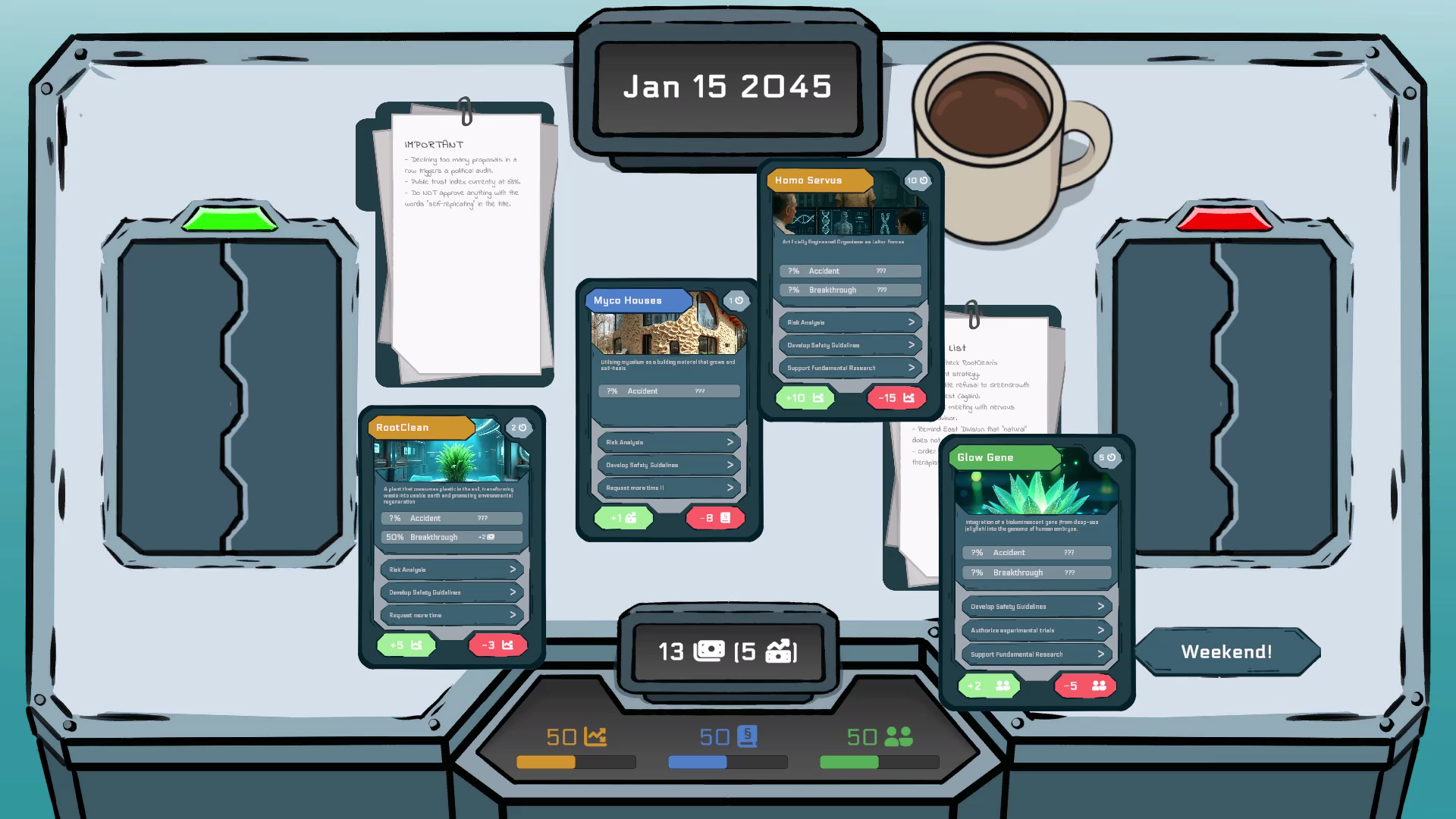 BioMandate 2045 is a narrative, turn-based decision-making and simulation game developed for the BioDesign Challenge. Set in the year 2045, players take on the role of a global biotechnology regulator. Each round, they must decide whether to approve, reject or postpone new technologies. Every decision impacts public trust, political stability and economic support. The challenge is to stay in office as long as possible without losing the balance between these three forces.