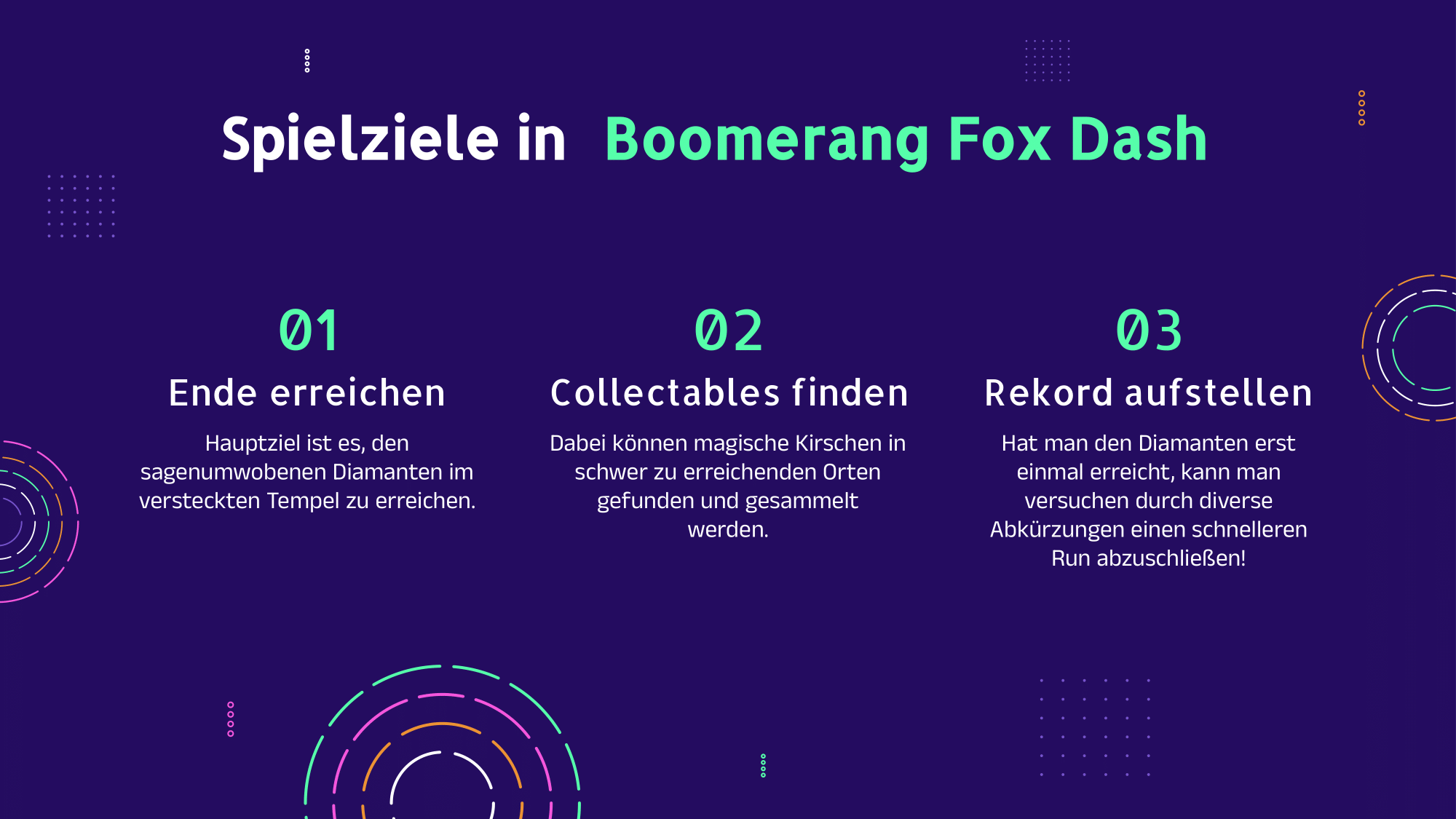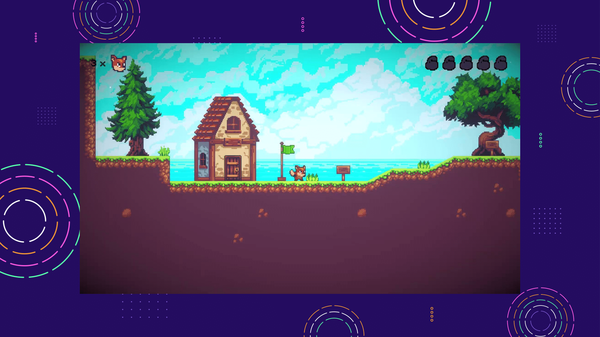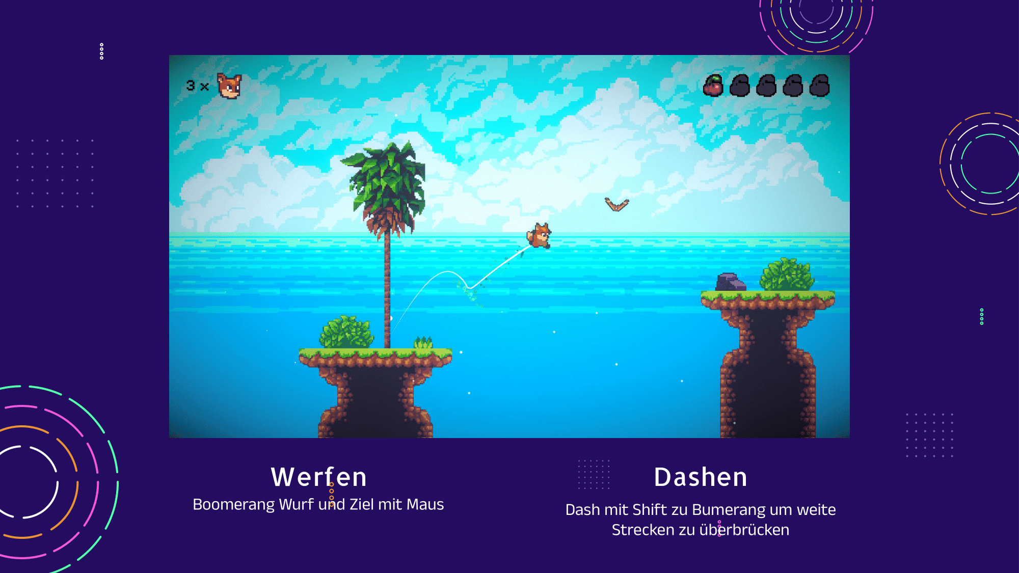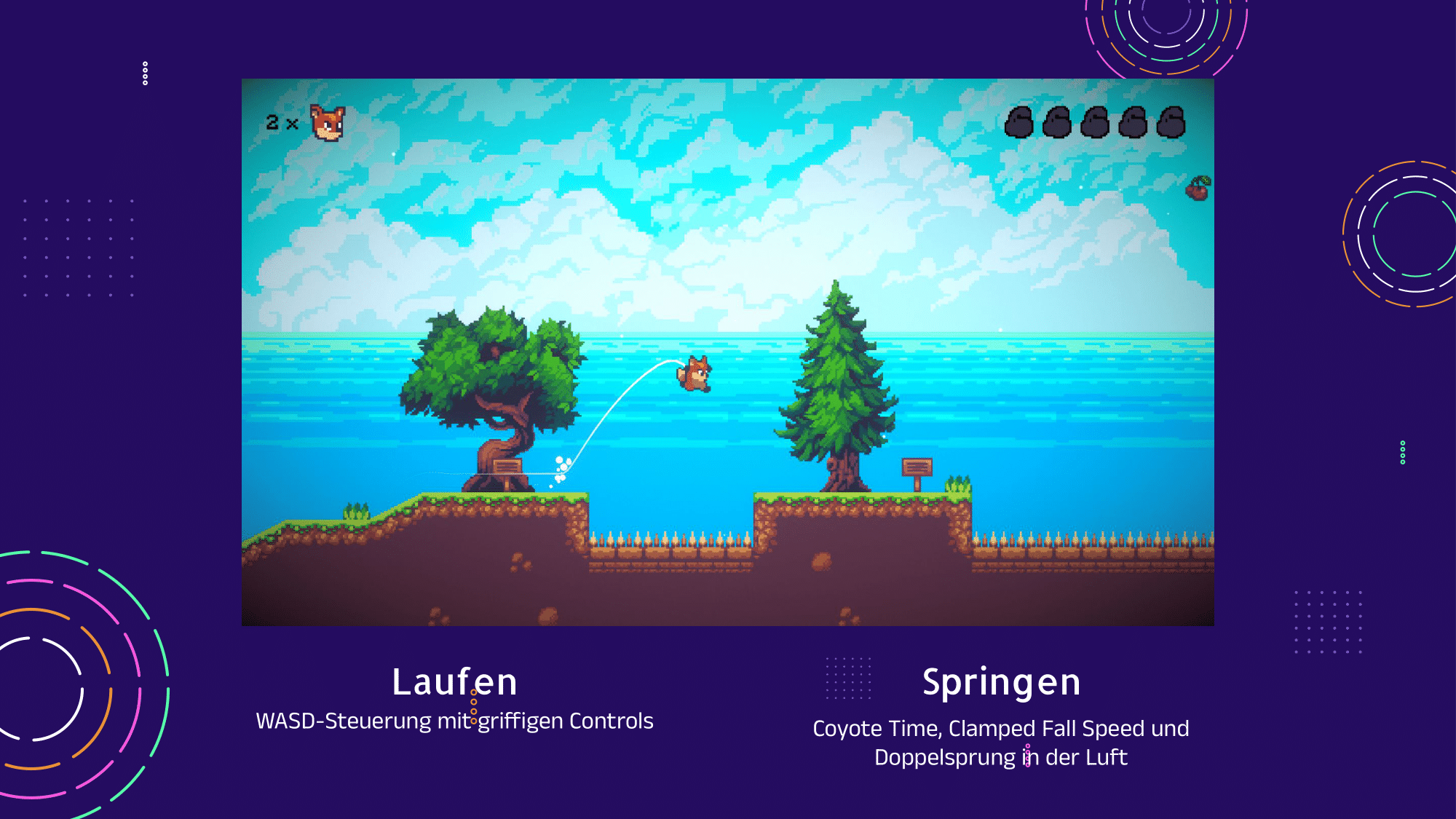 Boomerang Fox Dash is a small platformer created during the Game Engines and Scripting course. It uses the popular Sunny Lands asset pack, well known from the Brackeys jump and run tutorial series. Since the focus of the project was on engine functionality rather than art, this choice was perfectly suitable.