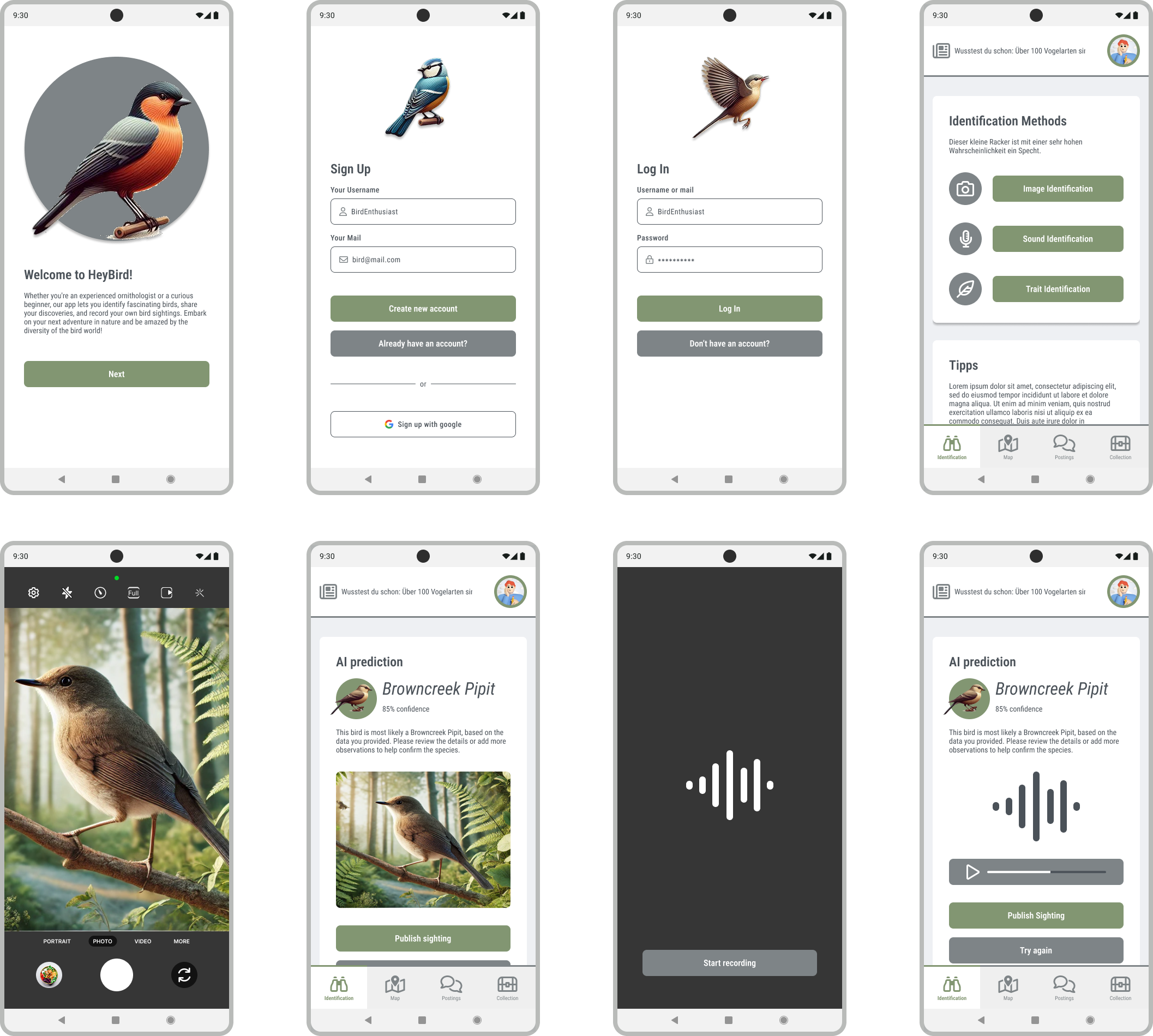 Hey Bird! is a concept for a bird watching app designed to meet the full range of needs of birdwatching enthusiasts. The project was developed during a module in my semester abroad and followed a user-centered design process. Throughout the course, I conducted target audience research, created user personas and user stories, carried out interviews, and designed a detailed prototype in Figma.